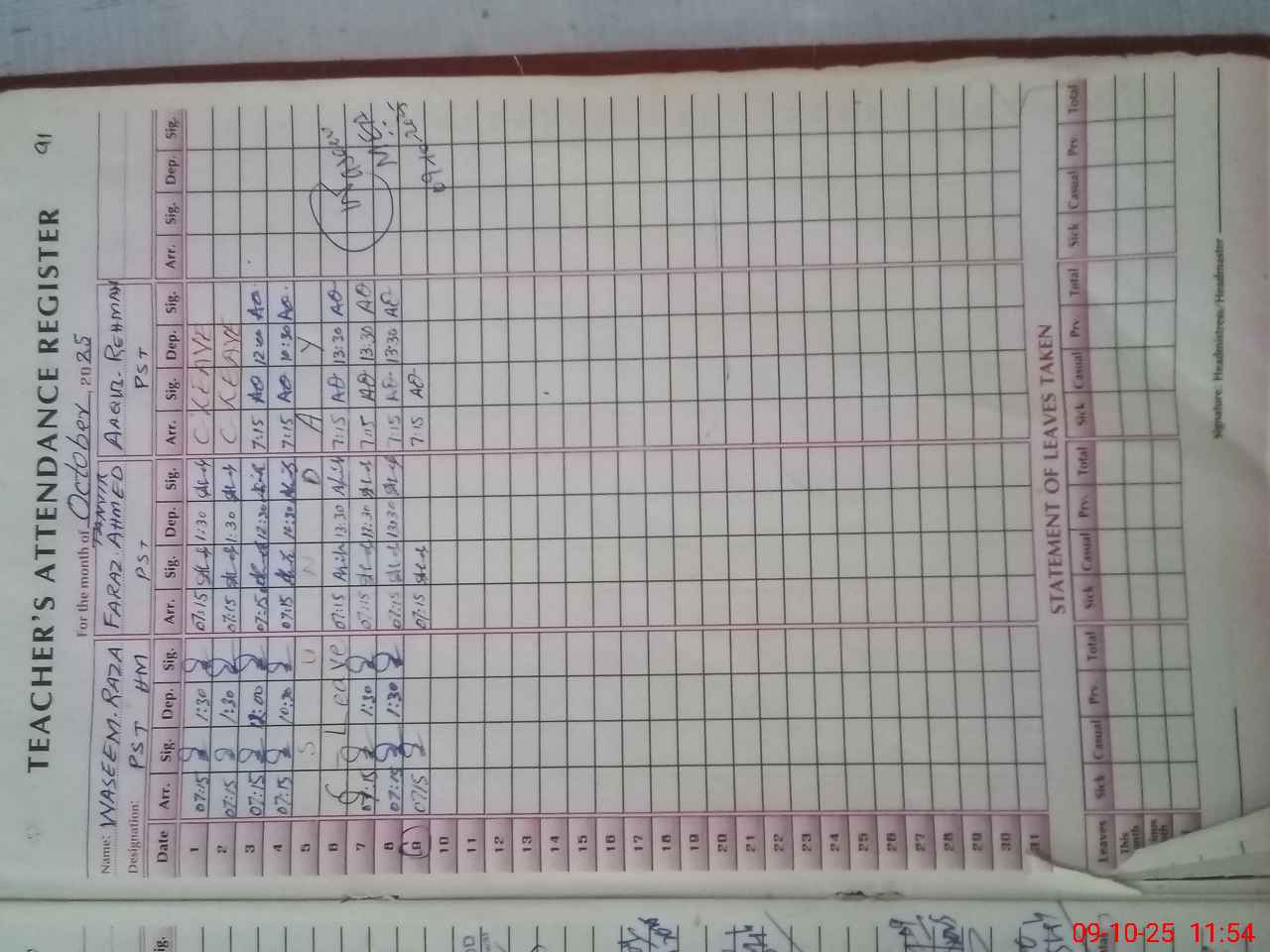 | CNIC | Full Name | Designation | R/C | Absence During Last Calender Month |