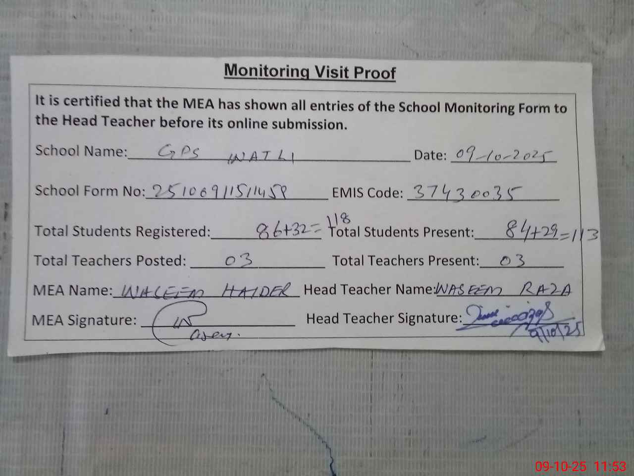 | Monitoring Date: 09-10-2025 | Start Time: 09-10-2025 11:36 AM | End Time: 09-10-2025 11:58 AM | Name of MEA: Wa**** Ha**** | |