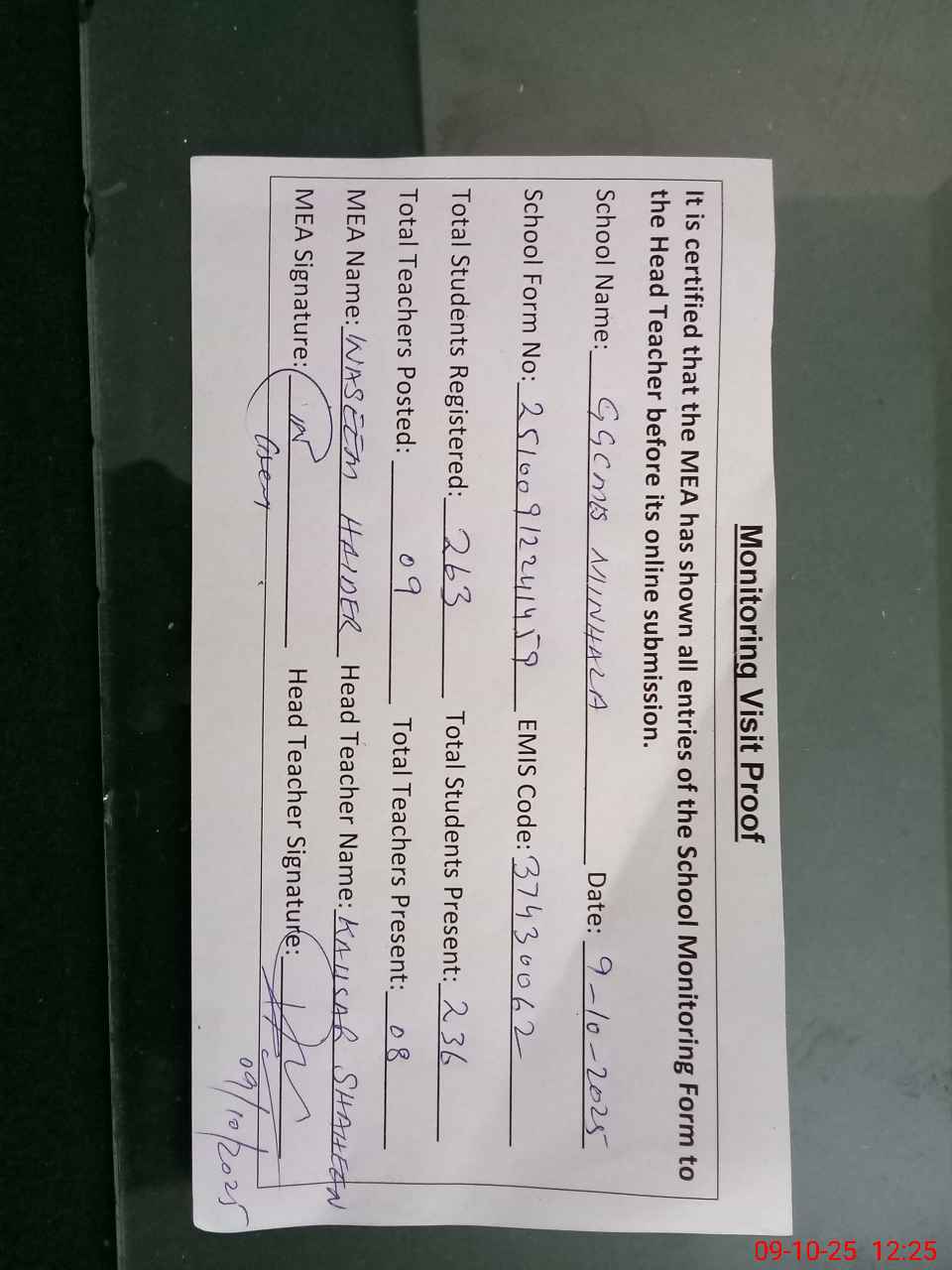 | Certified that this School was Inspected by the Undersigned MEA/DMO Today and the Information Stated Above is as Per Record. | |||||