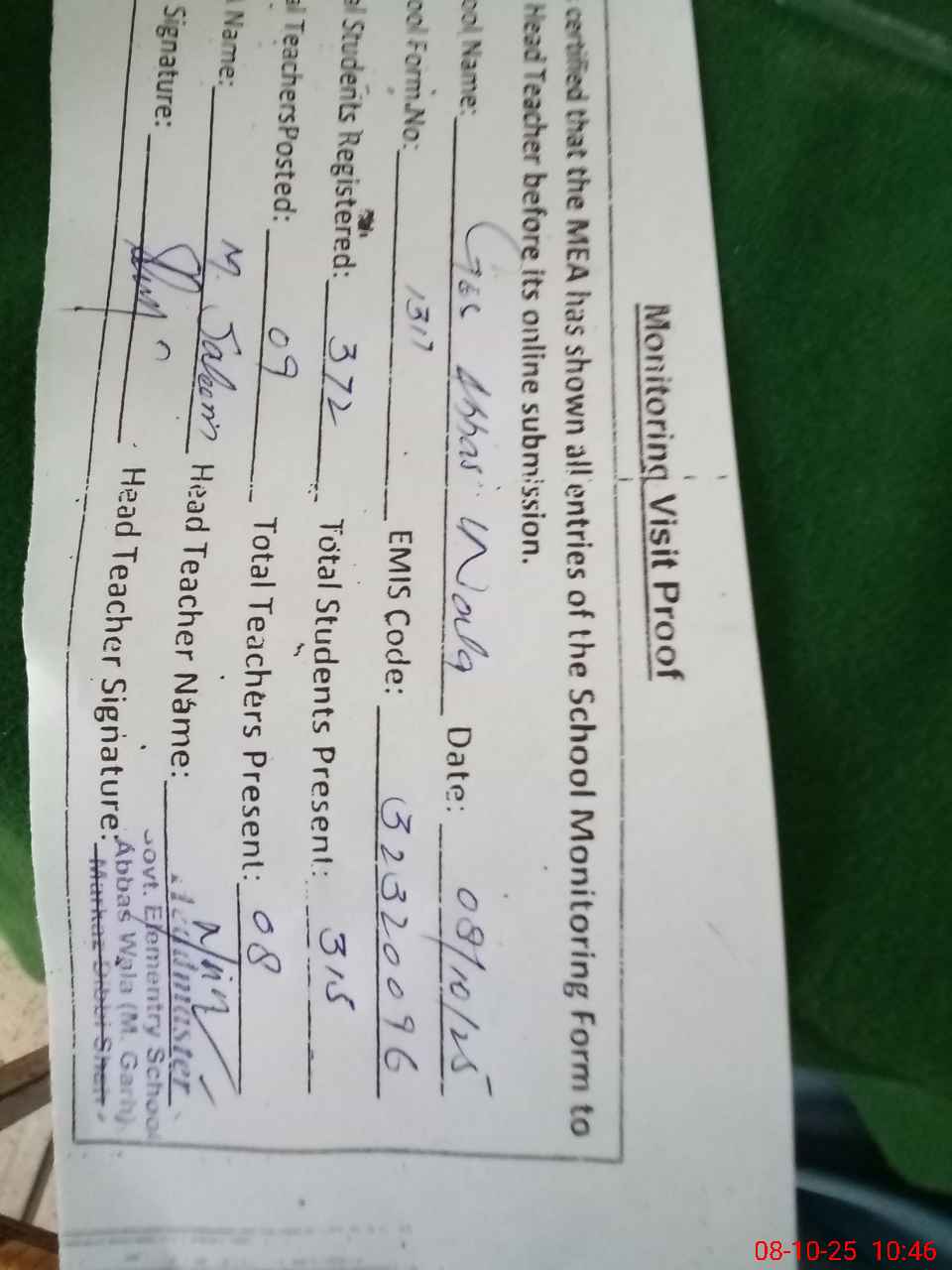| Attendance Register | Head Teacher | MEA with School | Visit Proof |