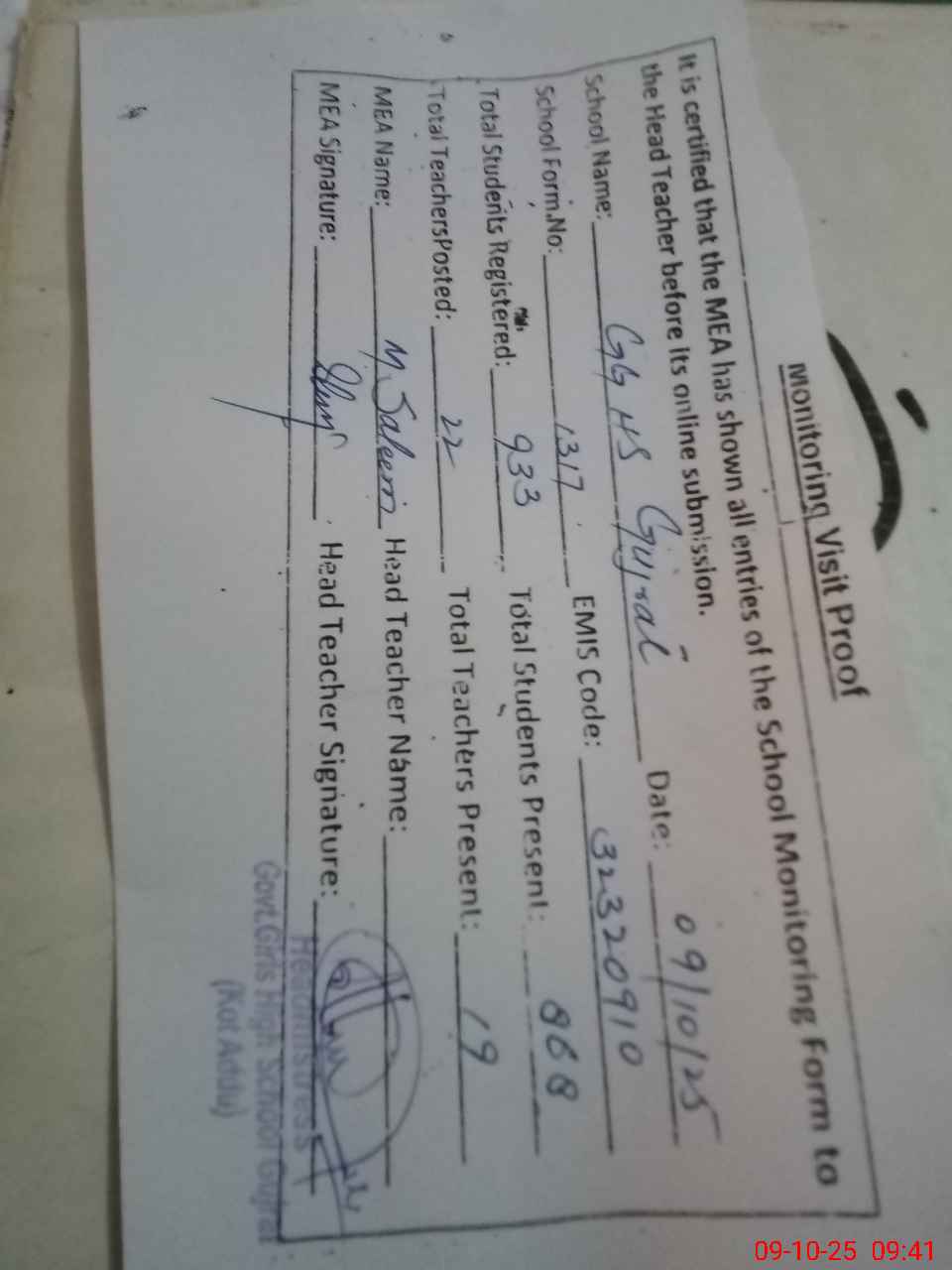 | EMIS Code: 32320910 | Name of School: GGHS GUJRAT | |||