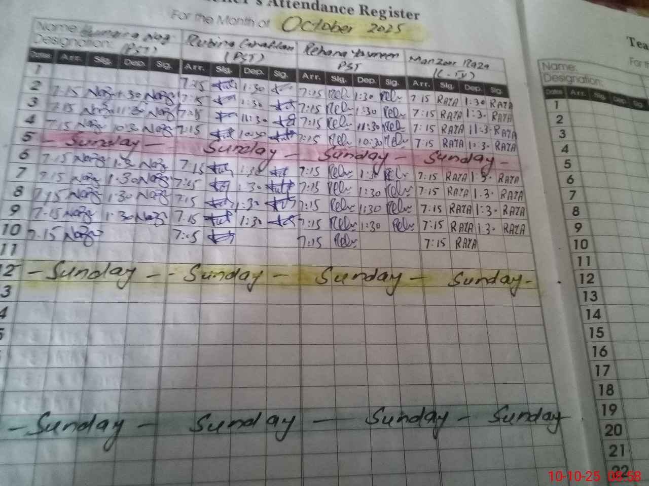 | CNIC | Full Name | Designation | R/C | Absence During Last Calender Month |