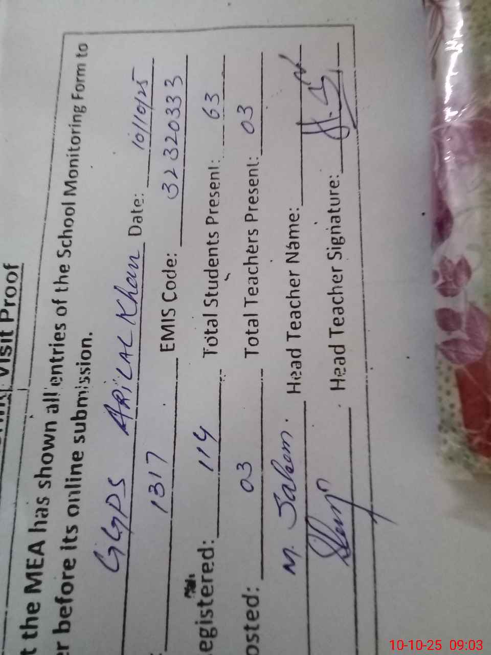 | Attendance Register | Head Teacher | MEA with School | Visit Proof |