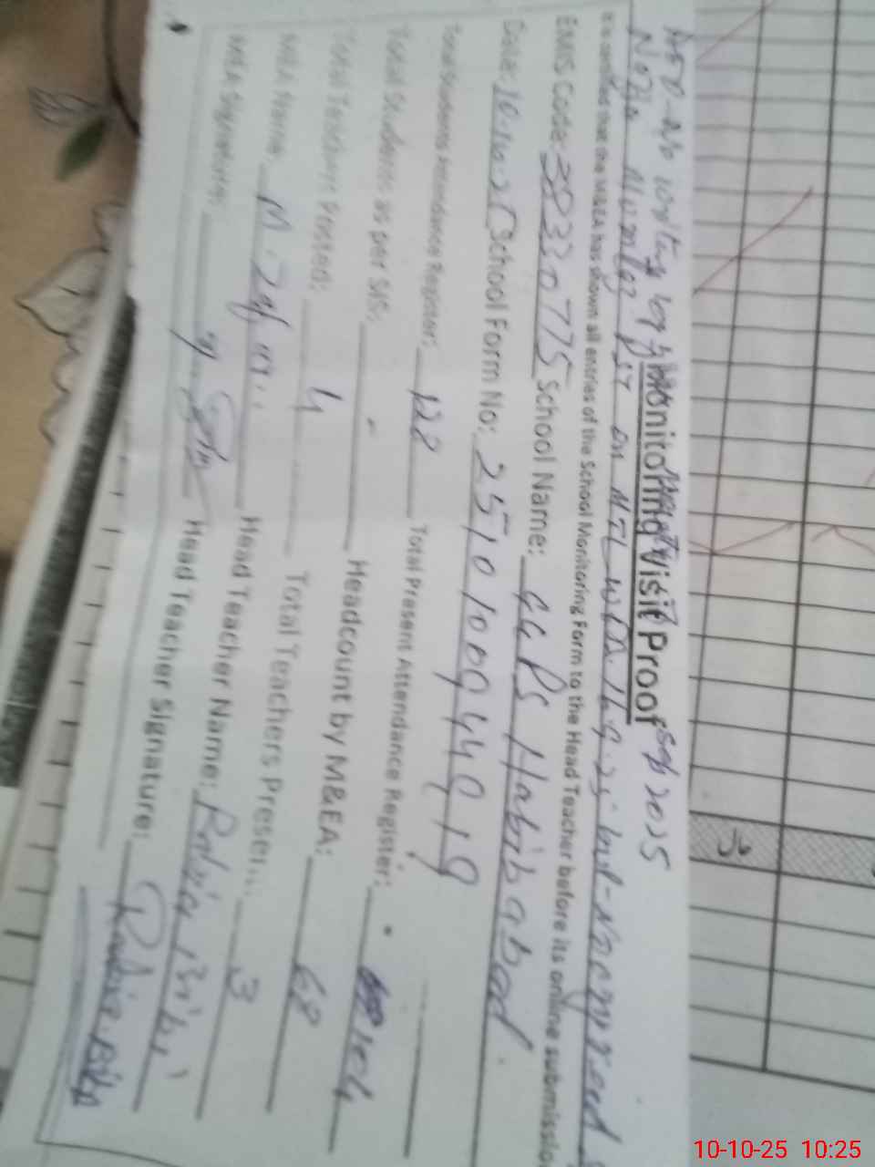 | Total no. of Classrooms: 5 No. of Classrooms Used for Teaching: 4 No. of Classrooms Storing Old Furniture, FTBs, etc: 0Comments if Any: Aeo not written log book month of September 2925 Nazia mumtaz pst on MTL wef 16 9 2025 but no any records show absent |