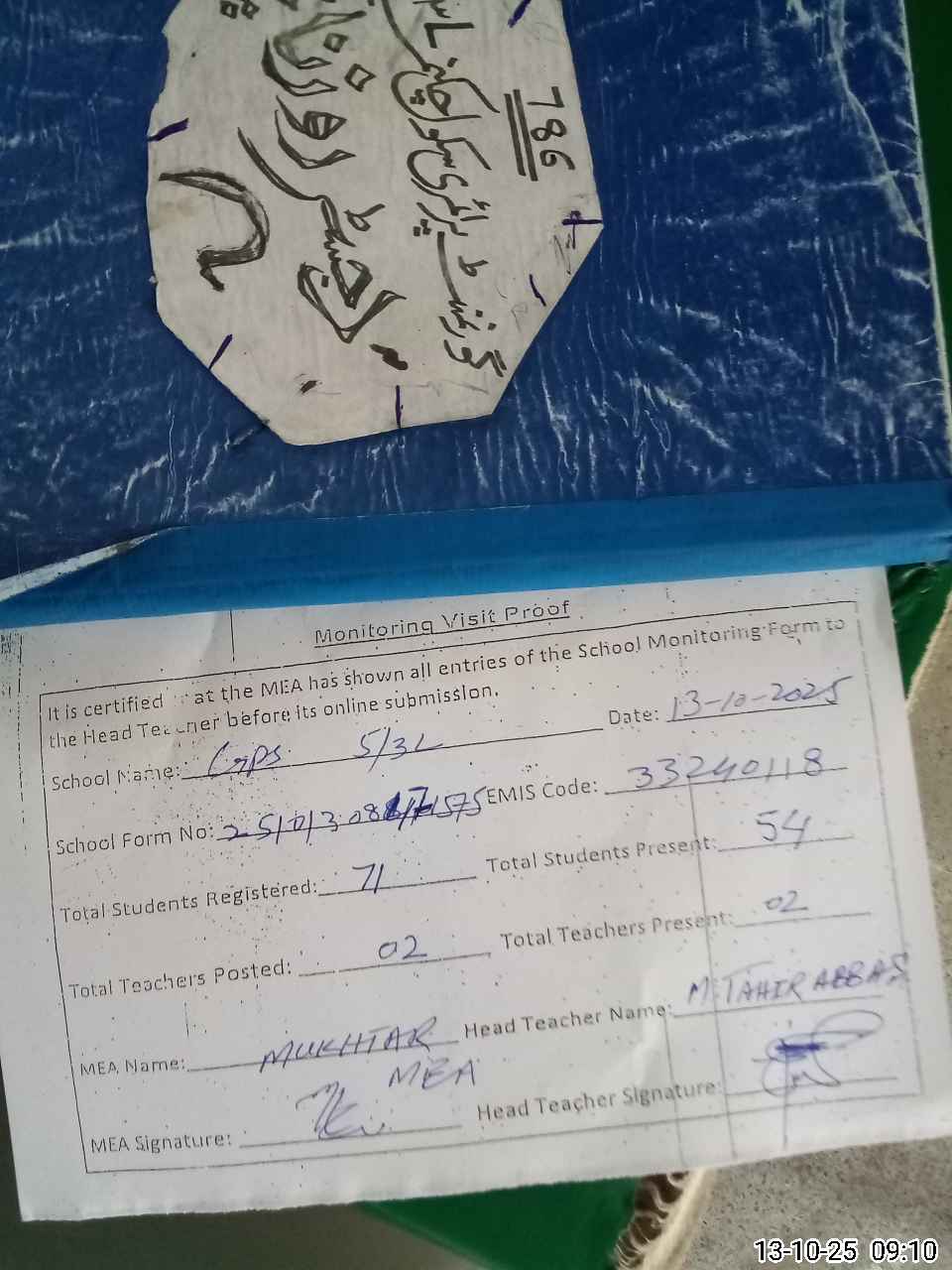 | Attendance Register | Head Teacher | MEA with School | Visit Proof |