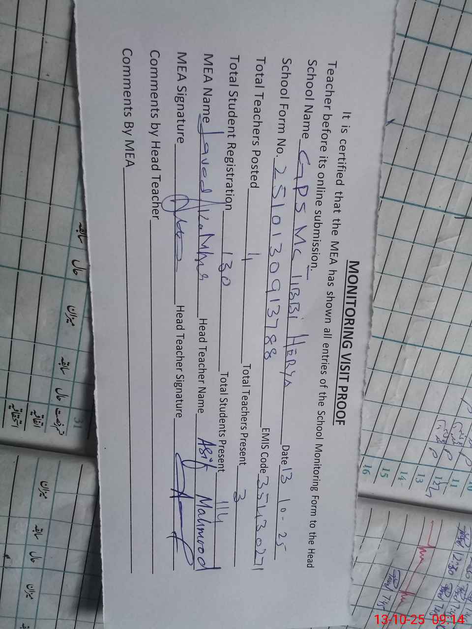 | Attendance Register | Head Teacher | MEA with School | Visit Proof |