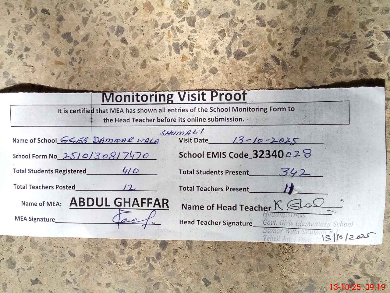 | Attendance Register | Head Teacher | MEA with School | Visit Proof |