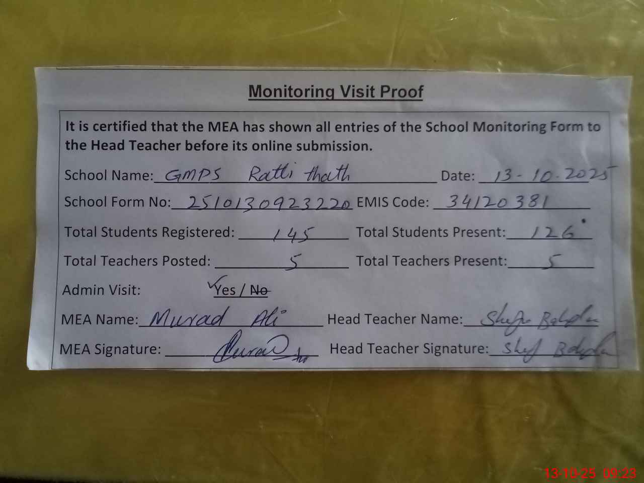 | Attendance Register | Head Teacher | MEA with School | Visit Proof |