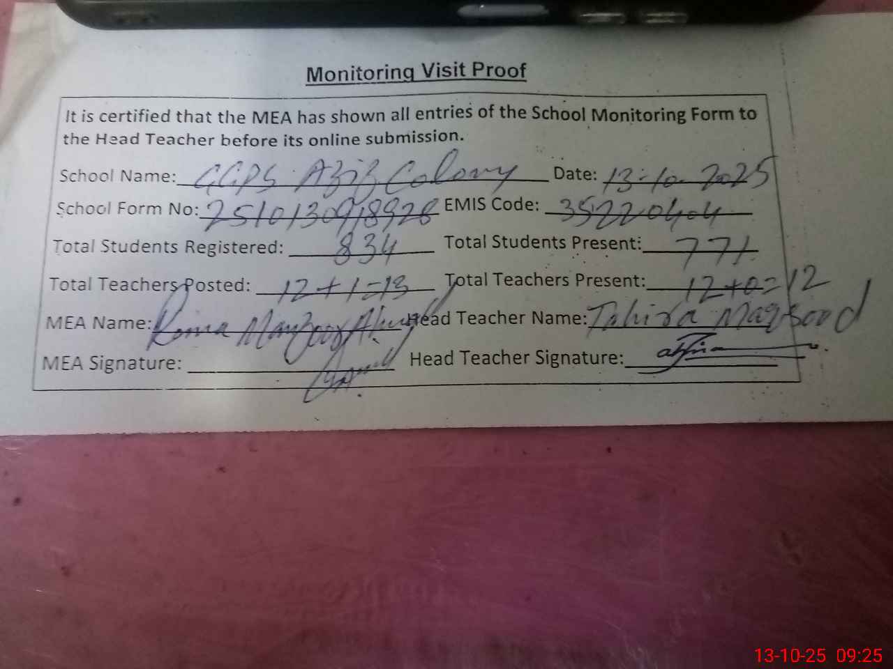 | EMIS Code: 35220404 | Name of School: GGPS AZIZ COLONY SHAHDARA | |||