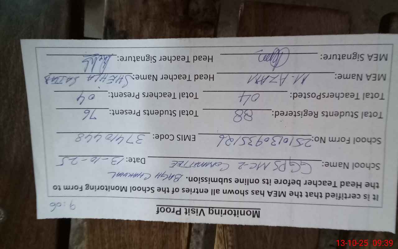 | Monitoring Date: 13-10-2025 | Start Time: 13-10-2025 09:06 AM | End Time: 13-10-2025 09:43 AM | Name of MEA: Mu**** Az**** | |