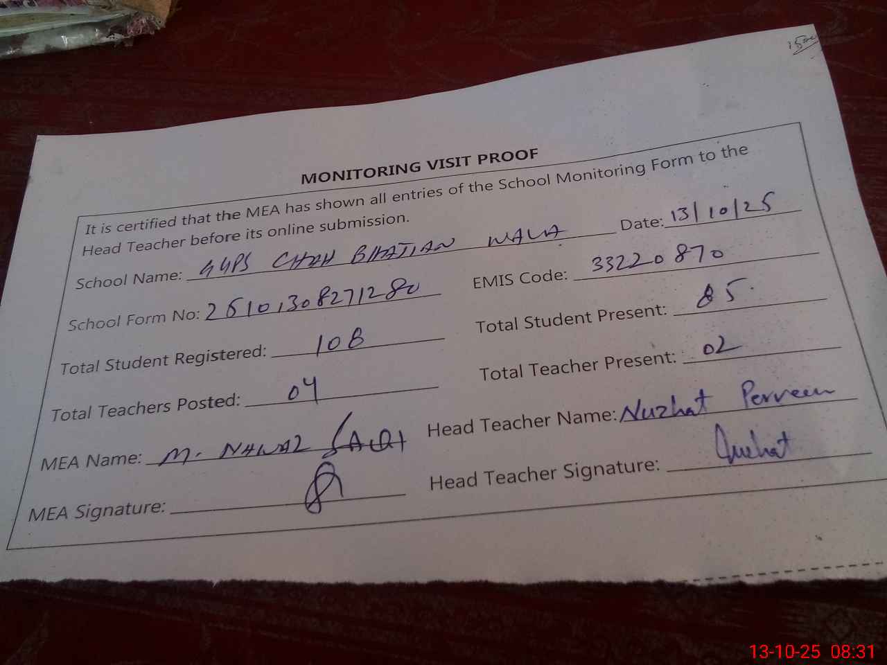 | Attendance Register | Head Teacher | MEA with School | Visit Proof |