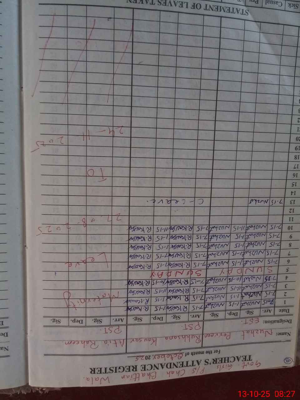 | CNIC | Full Name | Designation | R/C | Absence During Last Calender Month |