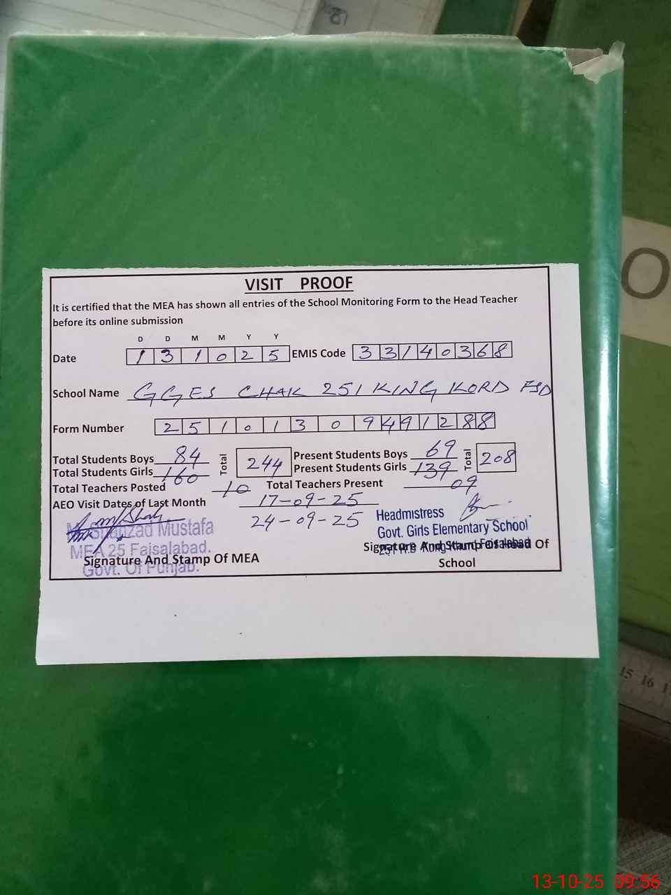 | Attendance Register | Head Teacher | MEA with School | Visit Proof |
