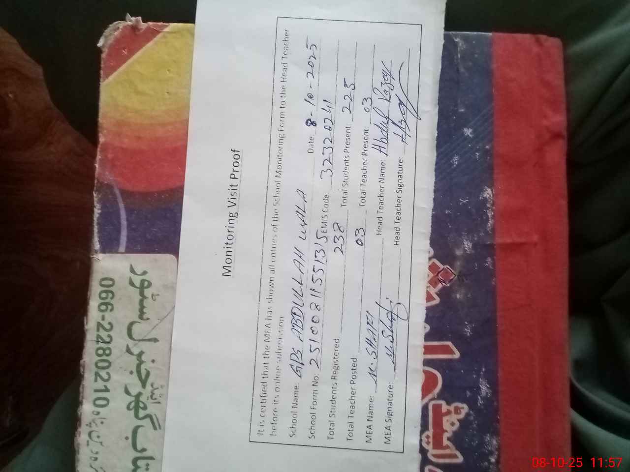 | Attendance Register | Head Teacher | MEA with School | Visit Proof |