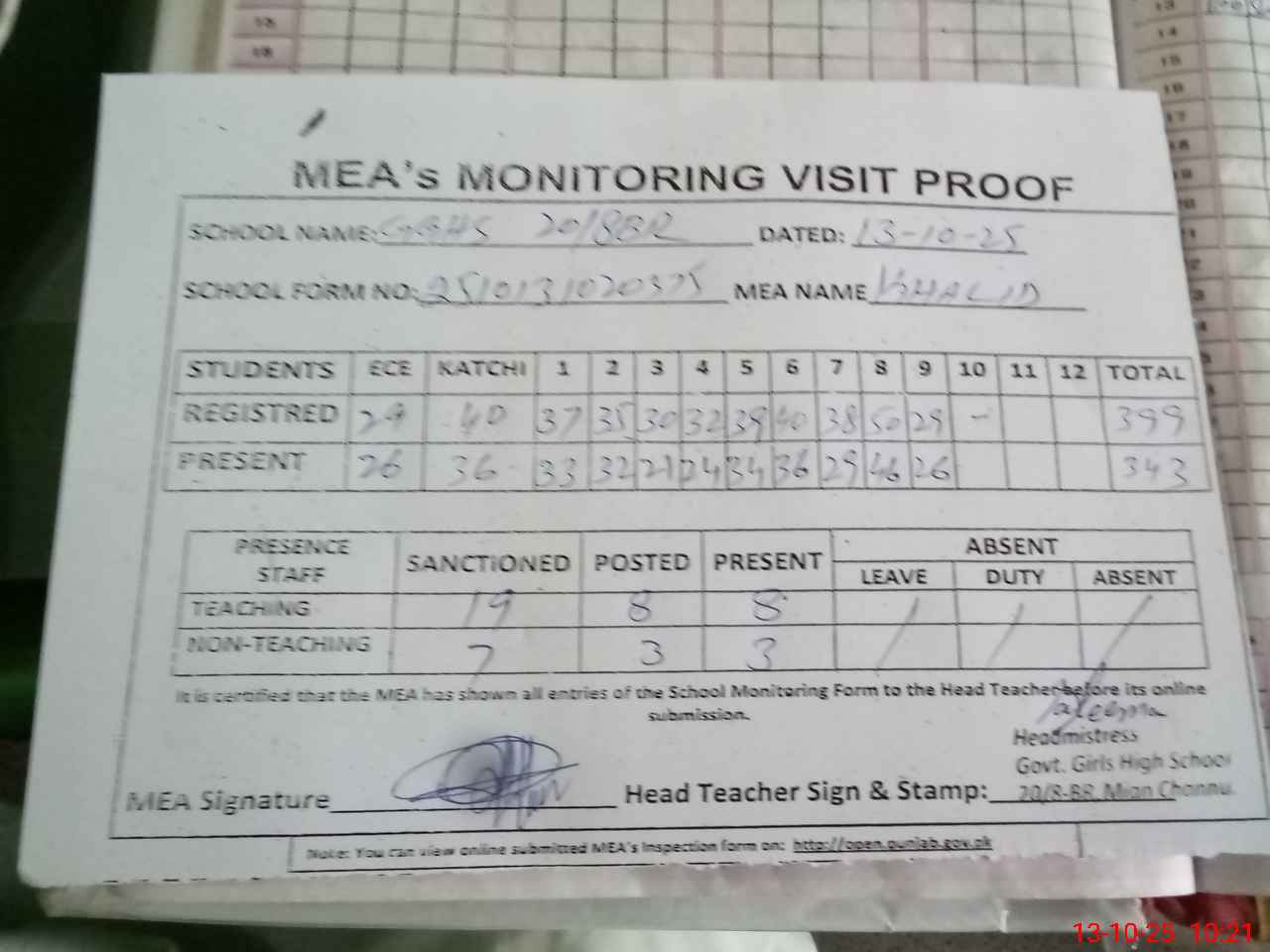 | Certified that this School was Inspected by the Undersigned MEA/DMO Today and the Information Stated Above is as Per Record. | |||||