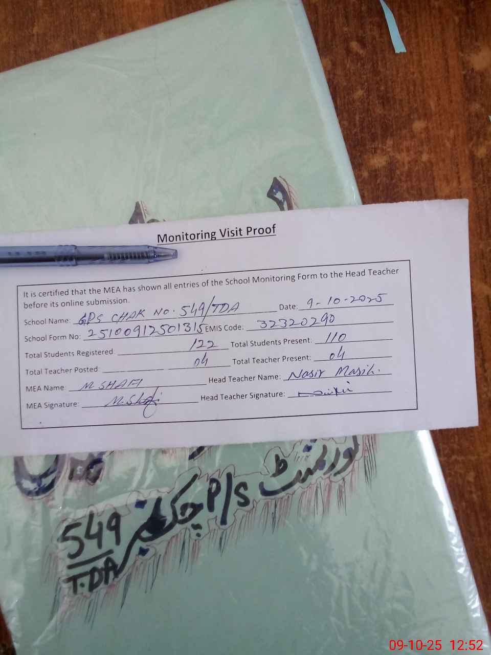 | Attendance Register | Head Teacher | MEA with School | Visit Proof |