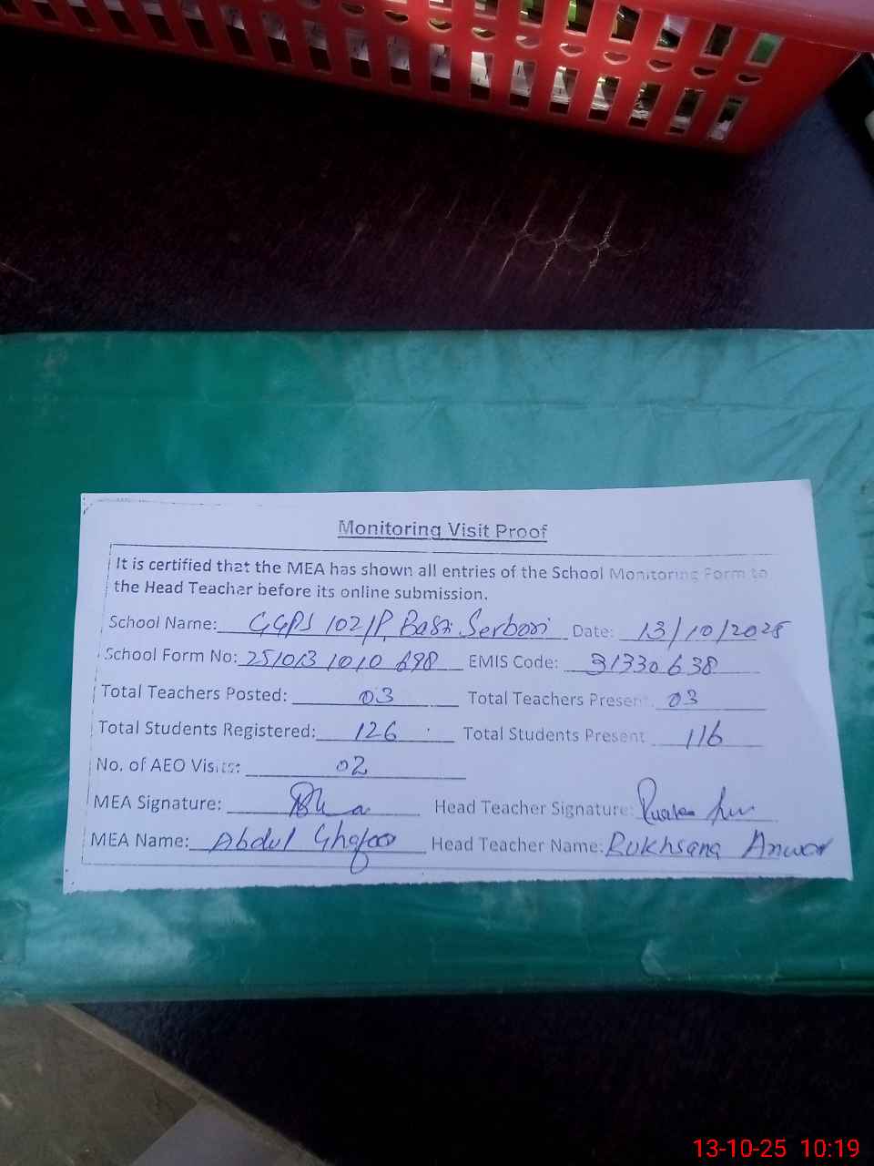 | Attendance Register | Head Teacher | MEA with School | Visit Proof |