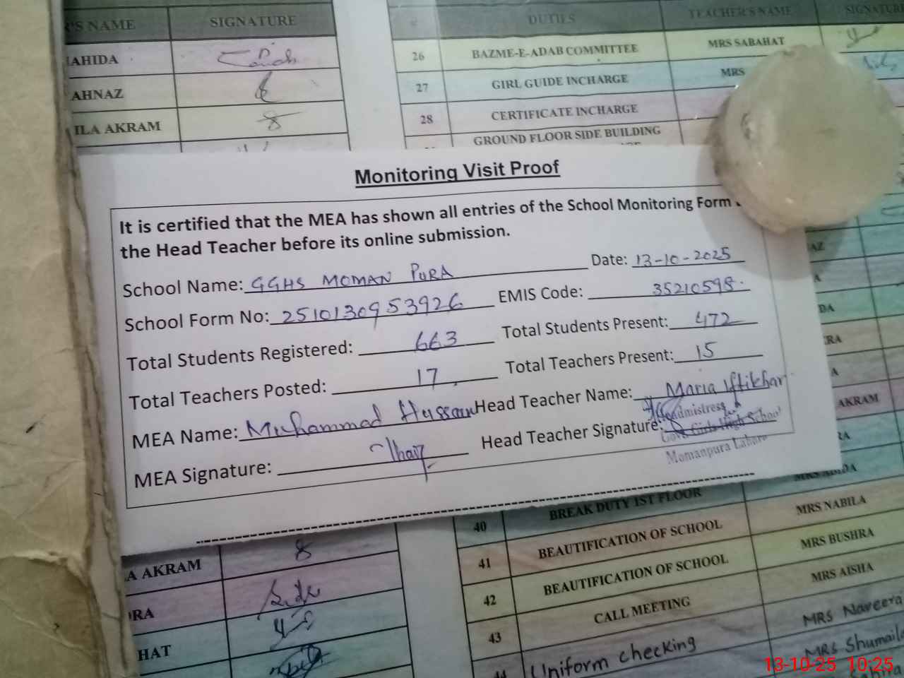 | Certified that this School was Inspected by the Undersigned MEA/DMO Today and the Information Stated Above is as Per Record. | |||||