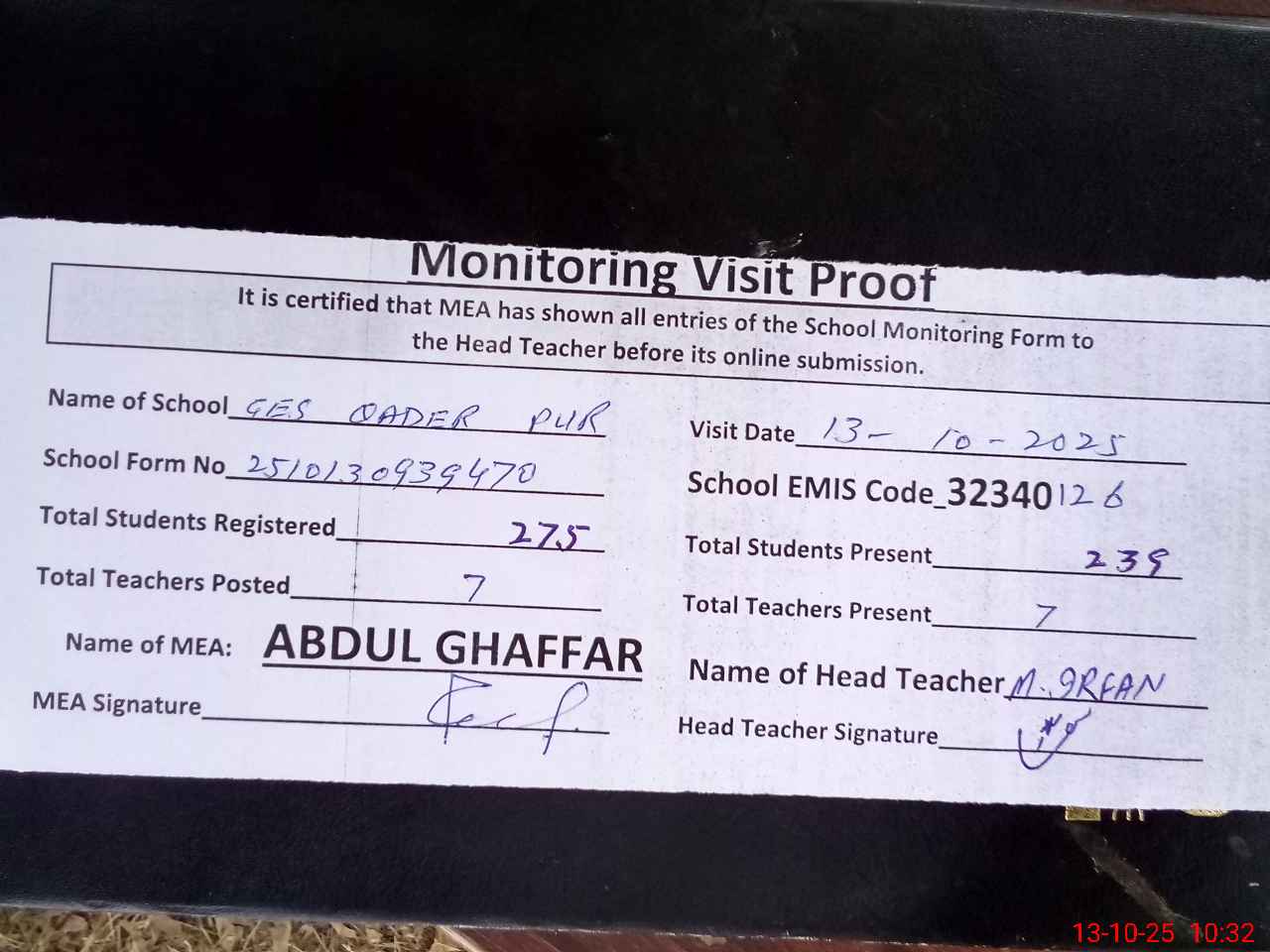 | Attendance Register | Head Teacher | MEA with School | Visit Proof |