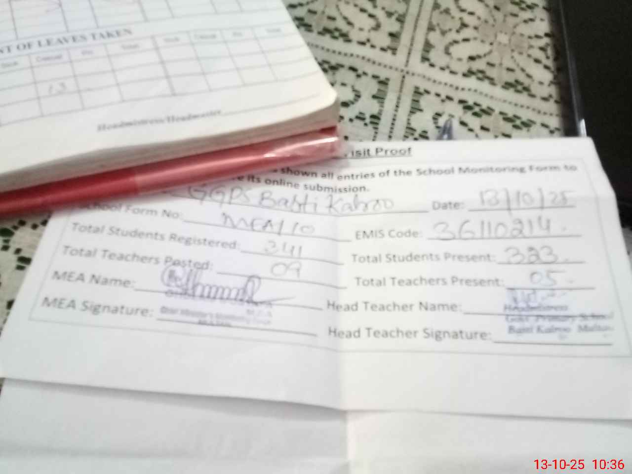| Attendance Register | Head Teacher | MEA with School | Visit Proof |