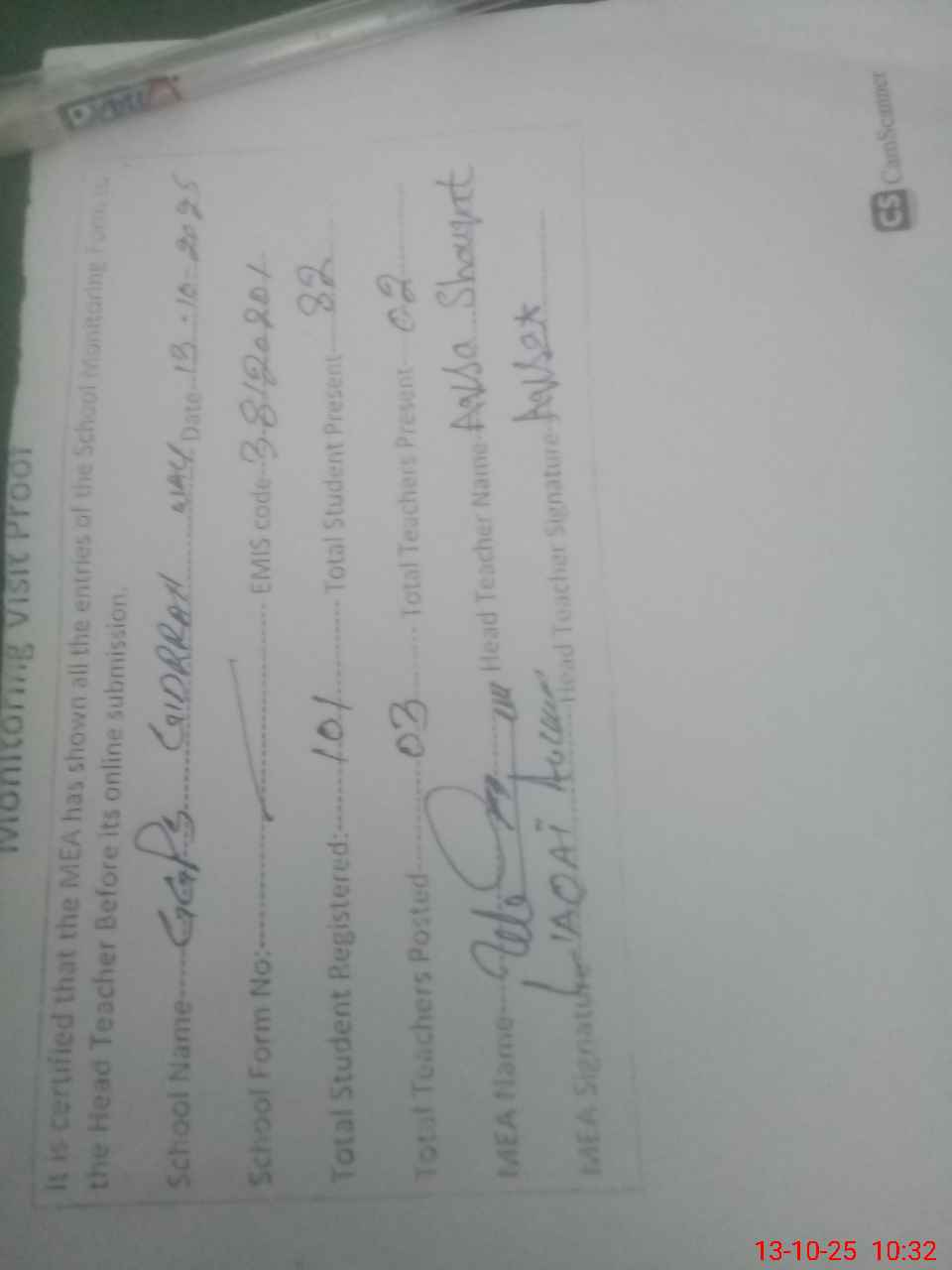 | Attendance Register | Head Teacher | MEA with School | Visit Proof |