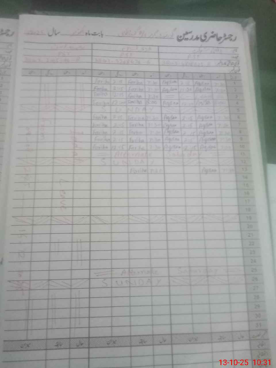 | CNIC | Full Name | Designation | R/C | Absence During Last Calender Month |