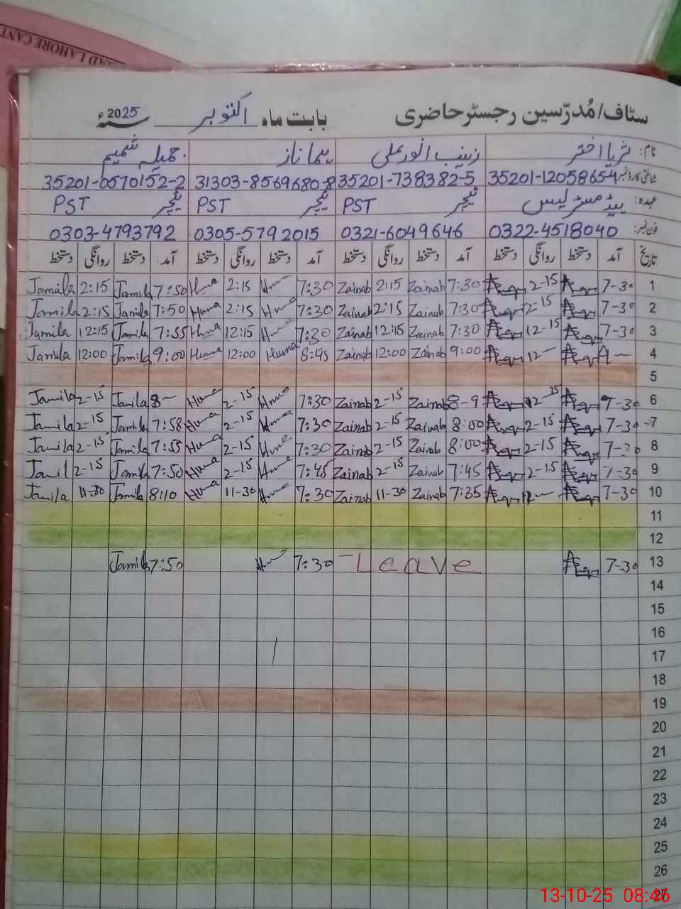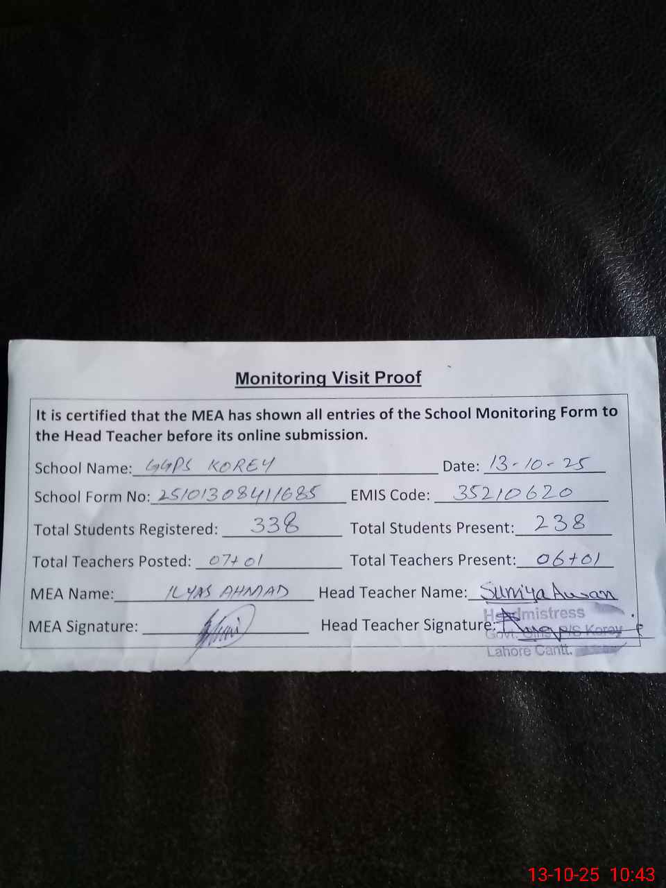 | Remarks (Use Separate Page if Required): Teacher Sabiha Maryam PST remained absent 07 days in September in different dates and 06 days in October from 2 to 6 Oct and 8 October 2025 but no disciplinary action has taken against her till the date School is facing shortage of class rooms 04 class rooms for about 240 out of 338 present today difficult to arrange specially kachi class over crowded 86 out of 123 student are in single class room Moreover classes are combined in different rooms 4th class sitting in Corridor | |||||