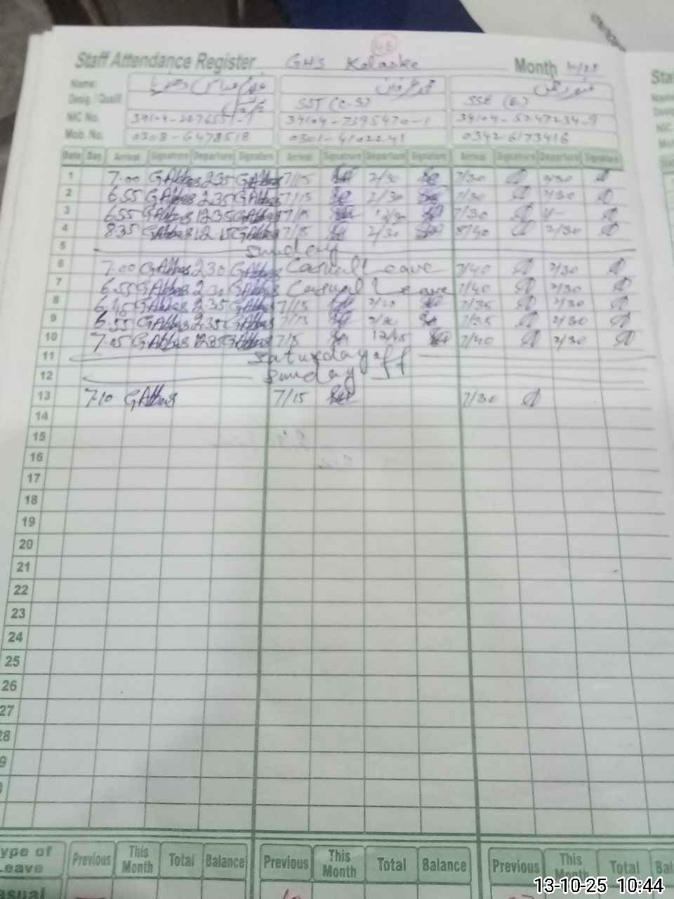 | CNIC | Full Name | Designation | R/C | Absence During Last Calender Month |