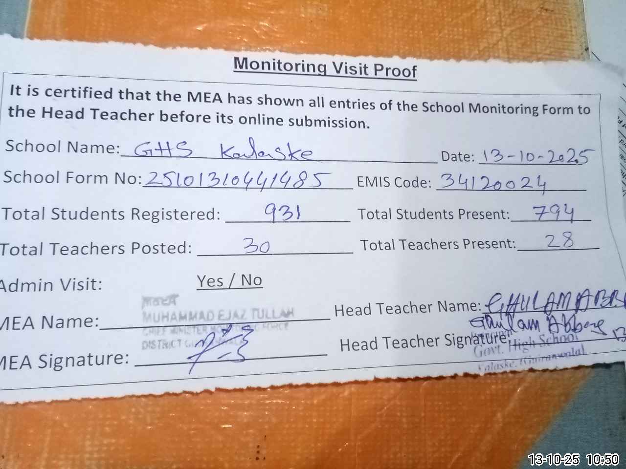 | Attendance Register | Head Teacher | MEA with School | Visit Proof |
