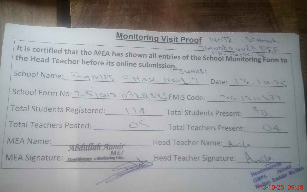 | EMIS Code: 36130573 | Name of School: GMPS CHAK NO.1-T JANUBI P/O NO 1 M | |||