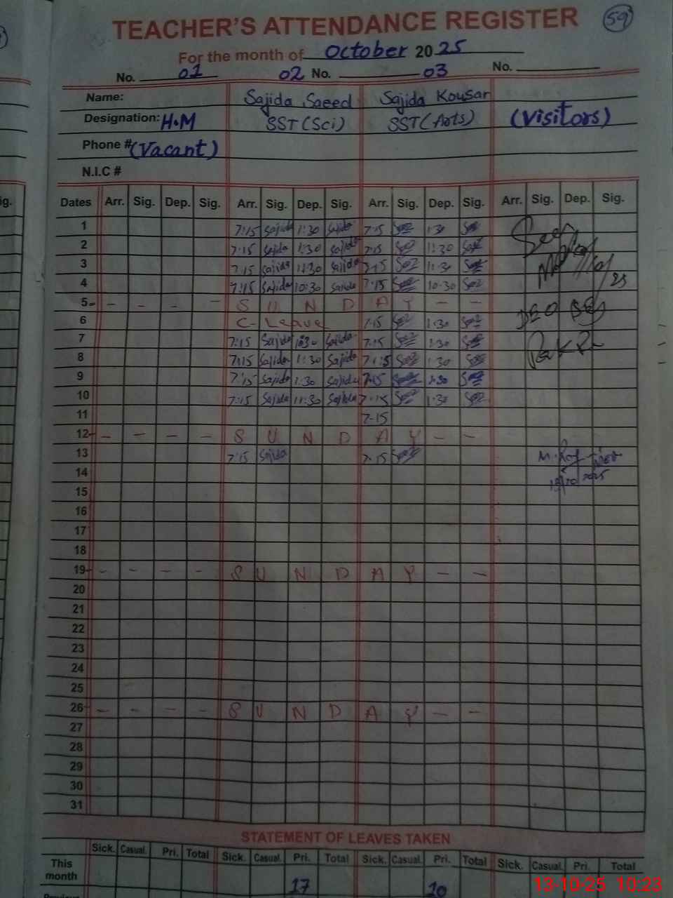 | CNIC | Full Name | Designation | R/C | Absence During Last Calender Month |
