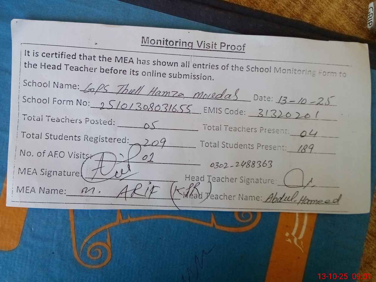 | Attendance Register | Head Teacher | MEA with School | Visit Proof |