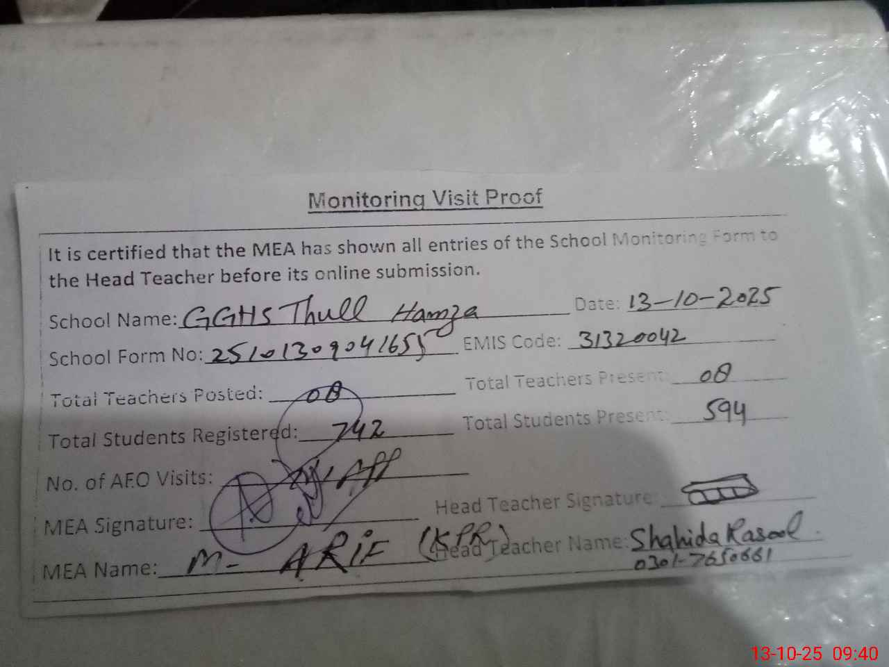 | EMIS Code: 31320042 | Name of School: GGHS THULL HAMZA | |||