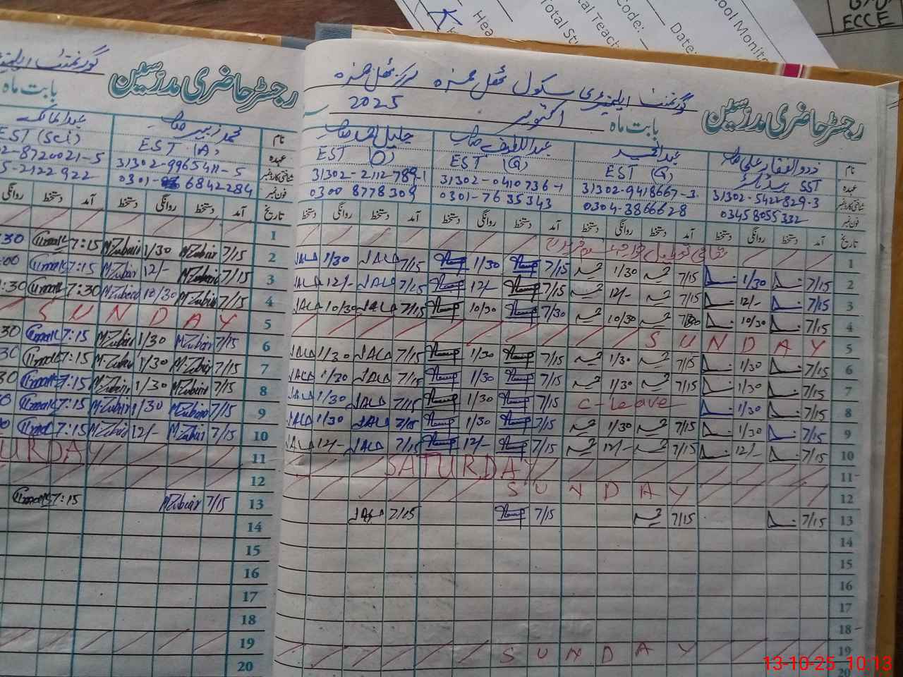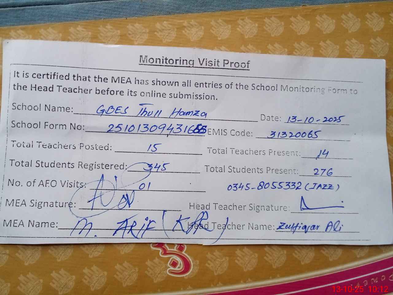 | Name: Zu**** Al**** Designation: (School Headmaster's/Headmistress's) SST Phone/Cell Number: 03**** |