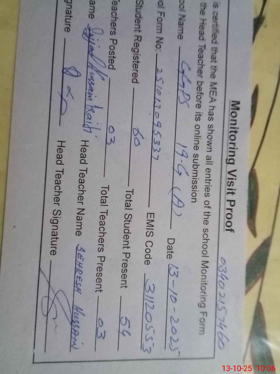 | Attendance Register | Head Teacher | MEA with School | Visit Proof |