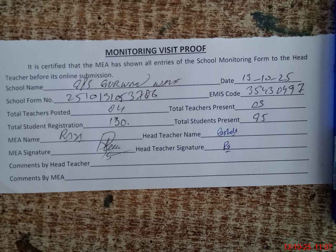 | Attendance Register | Head Teacher | MEA with School | Visit Proof |