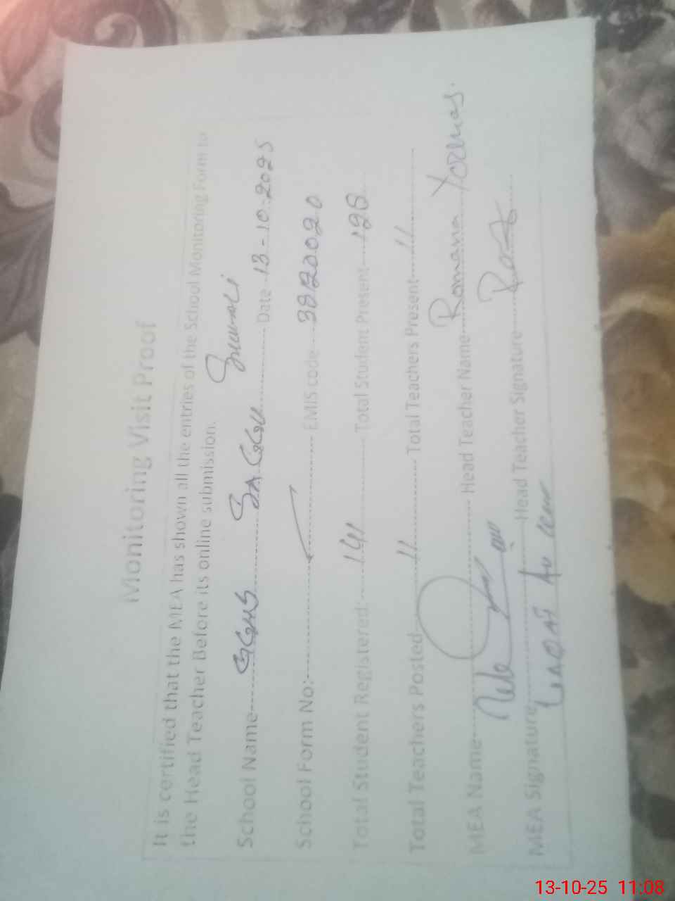| Attendance Register | Head Teacher | MEA with School | Visit Proof |