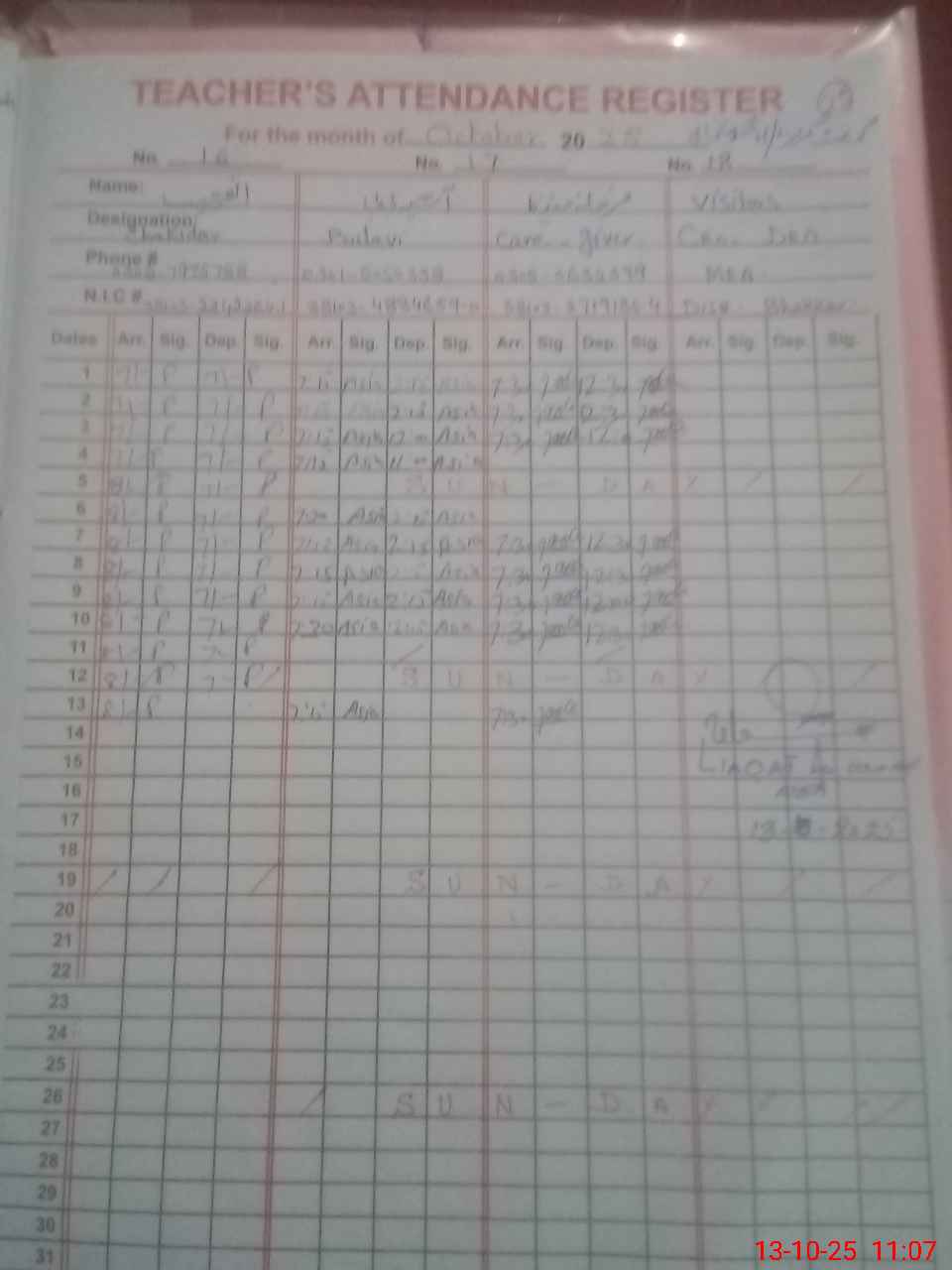 | CNIC | Full Name | Designation | R/C | Absence during last cal. month |
