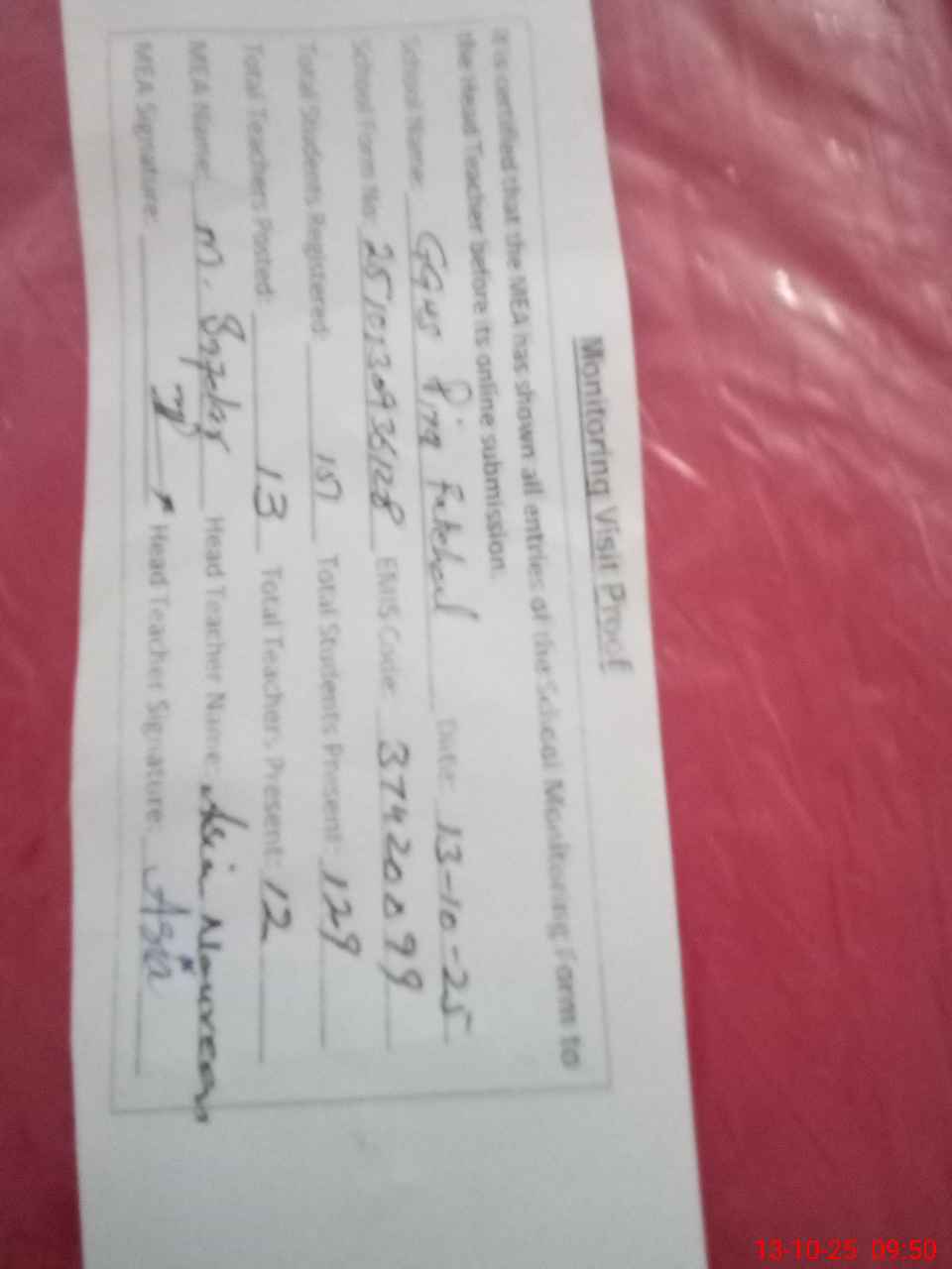 | Attendance Register | Head Teacher | MEA with School | Visit Proof |