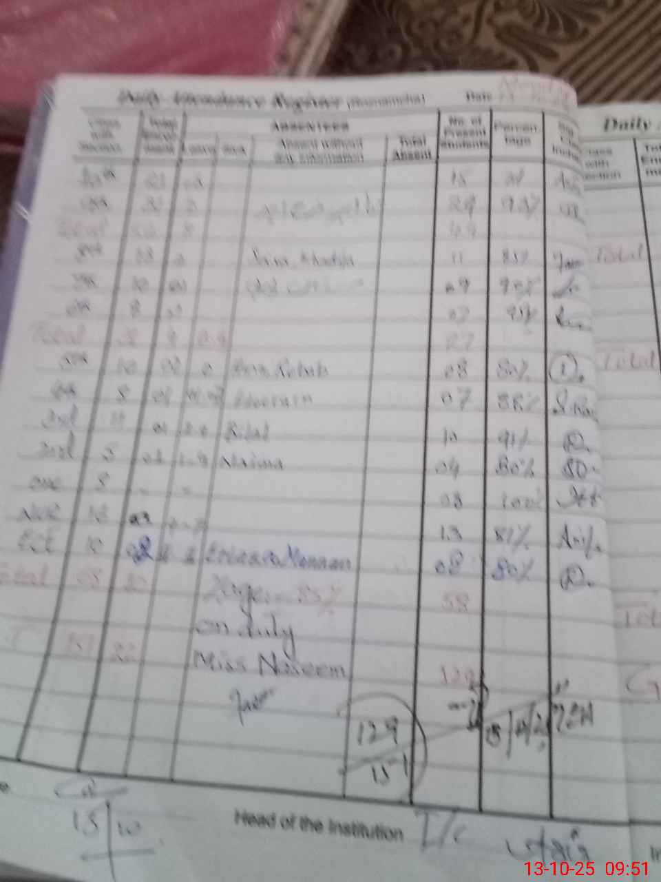 | Total Students Present | 8 | 0 | 13 | 8 | 4 | 10 | 7 | 8 | 7 | 9 | 11 | 29 | 15 | 129 | ||