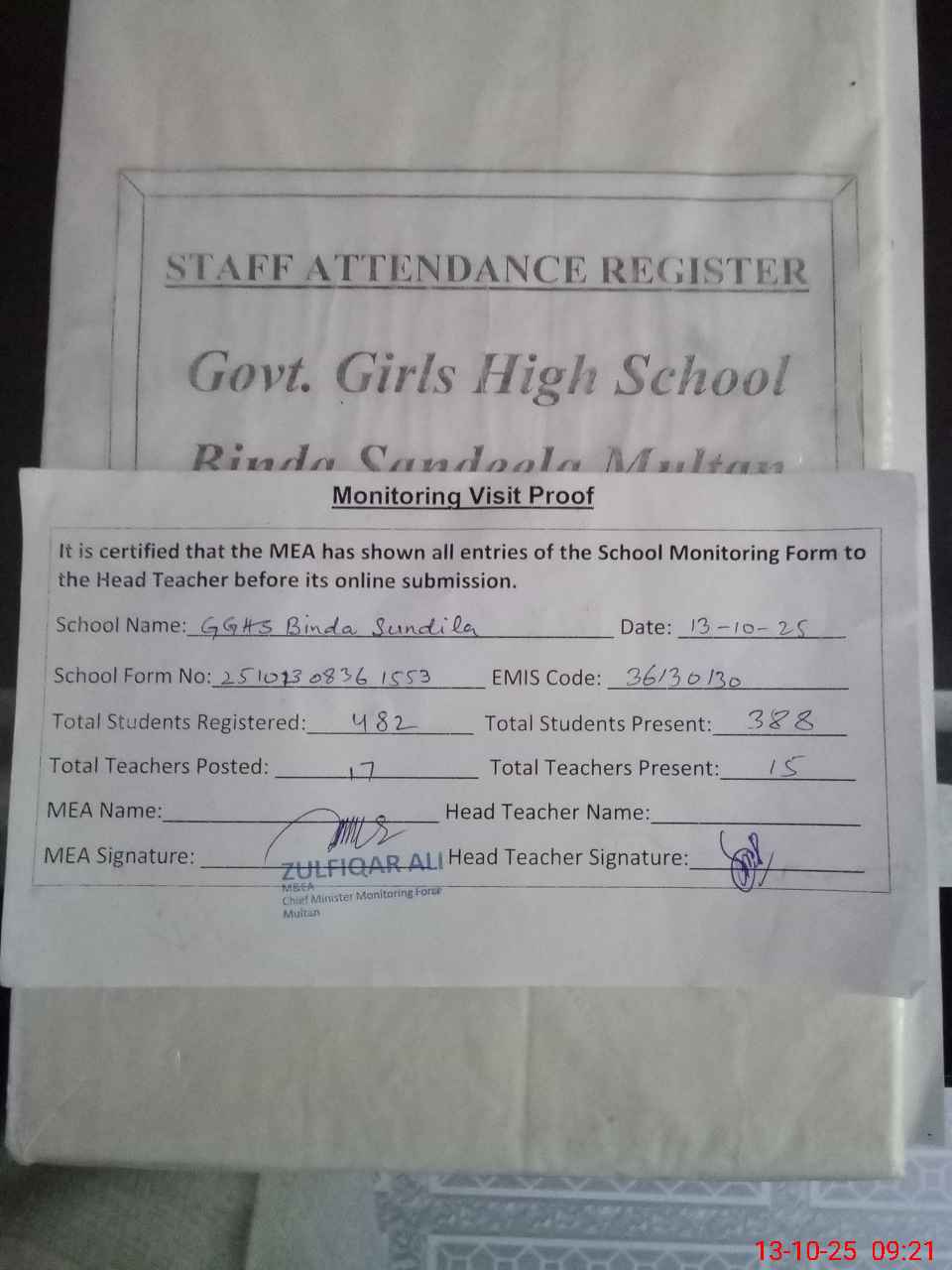 | Attendance Register | Head Teacher | MEA with School | Visit Proof |