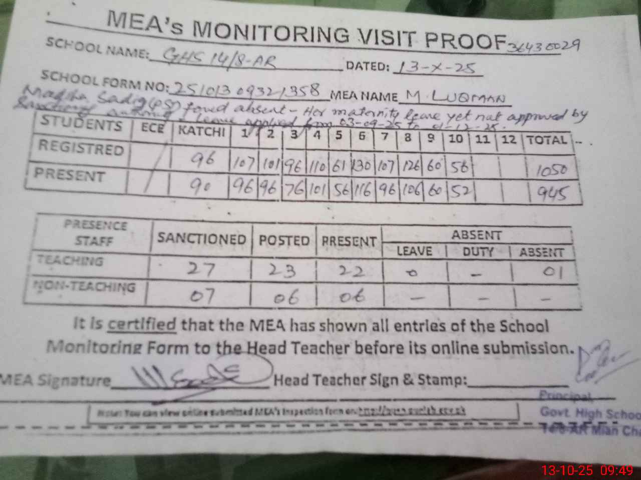 | Certified that this School was Inspected by the Undersigned MEA/DMO Today and the Information Stated Above is as Per Record. | |||||