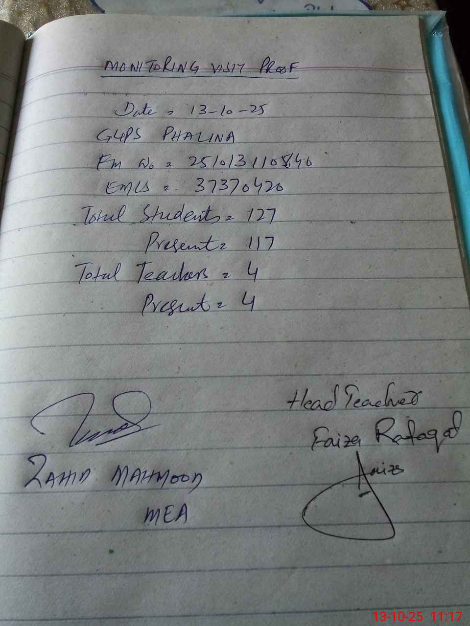 | Attendance Register | Head Teacher | MEA with School | Visit Proof |