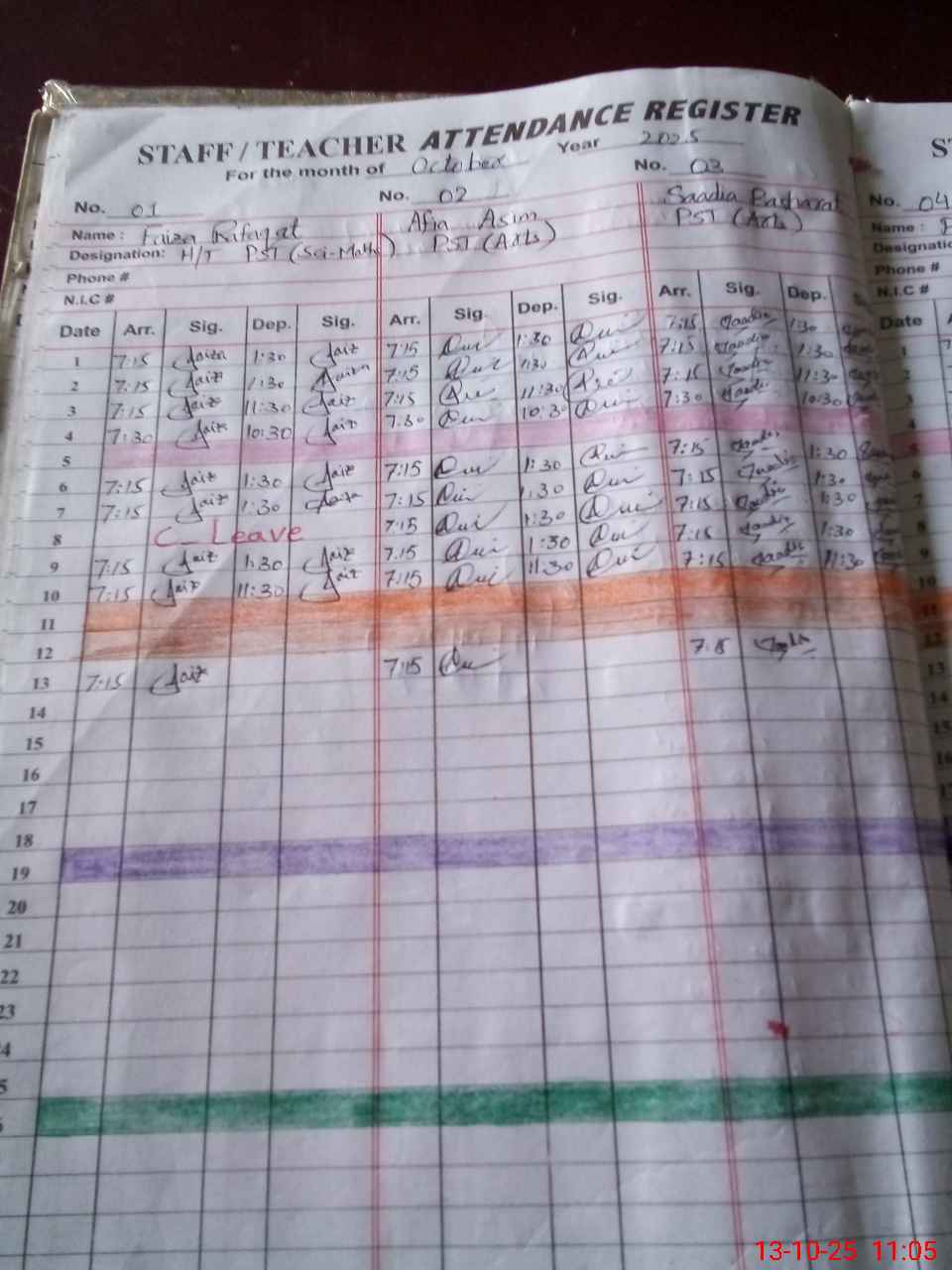 | CNIC | Full Name | Designation | R/C | Absence During Last Calender Month |