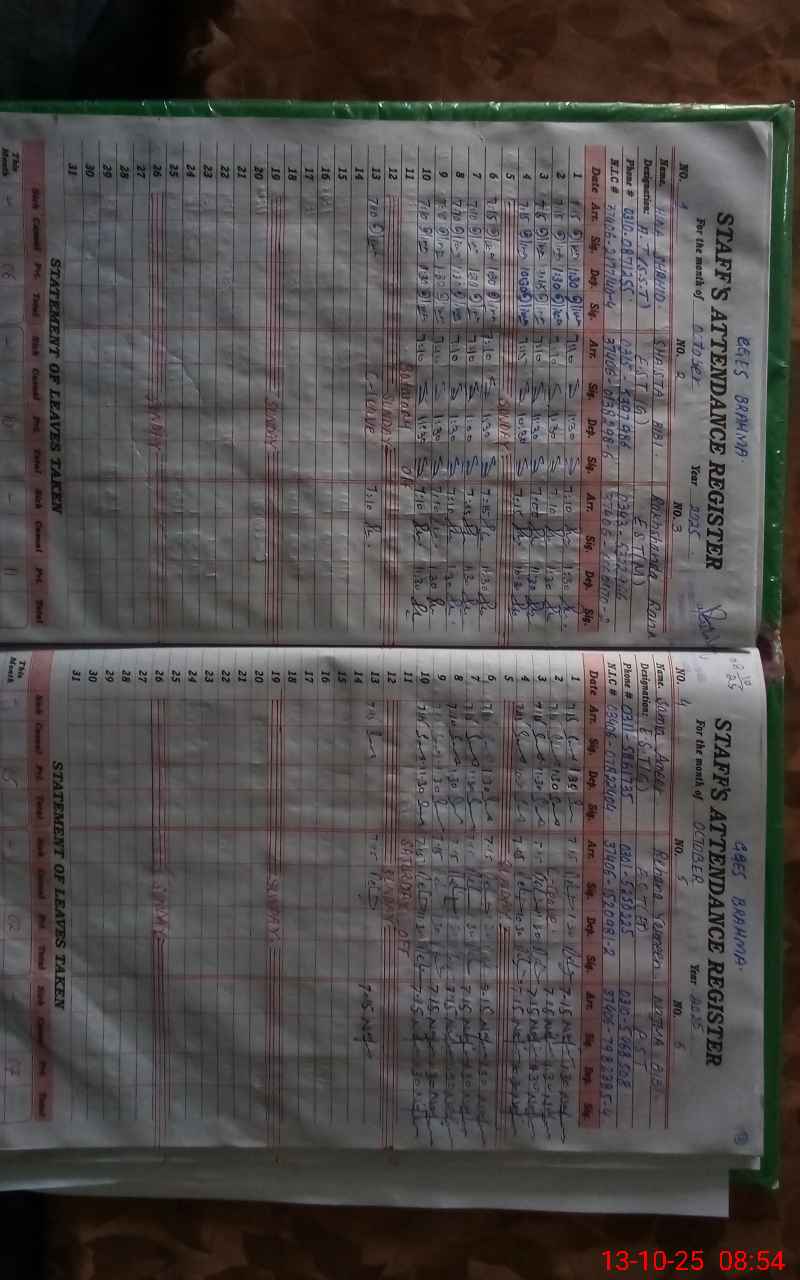 | CNIC | Full Name | Designation | R/C | Absence During Last Calender Month |
