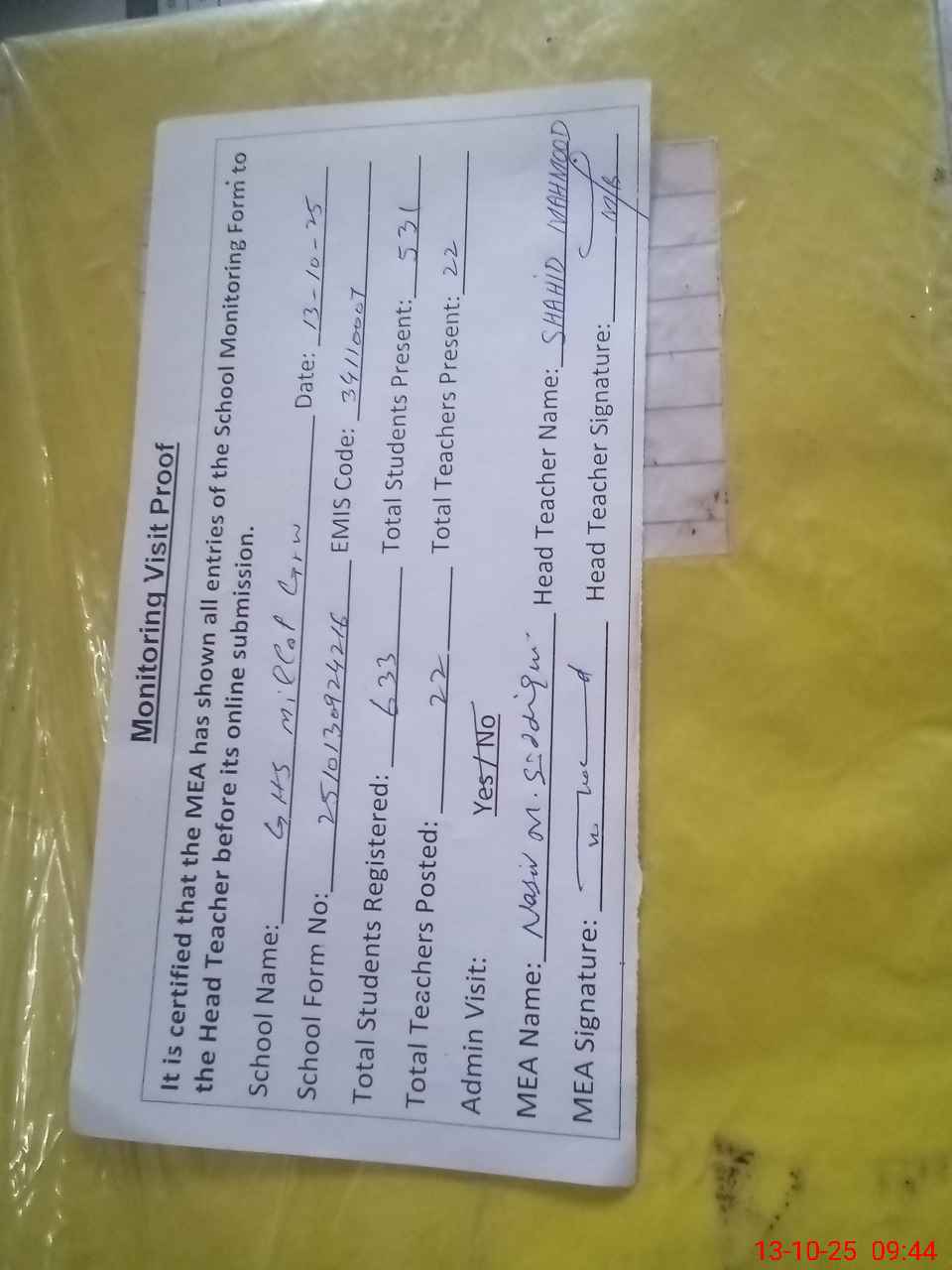 | Attendance Register | Head Teacher | MEA with School | Visit Proof |
