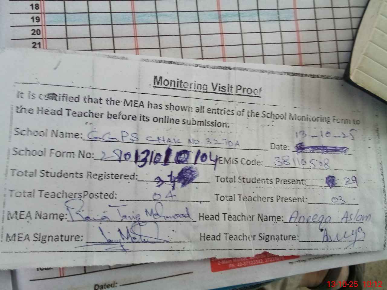 | Attendance Register | Head Teacher | MEA with School | Visit Proof |