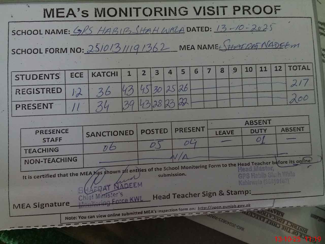 | EMIS Code: 36410182 | Name of School: GPS HABIB SHAH WALA, KABIRWALA | |||