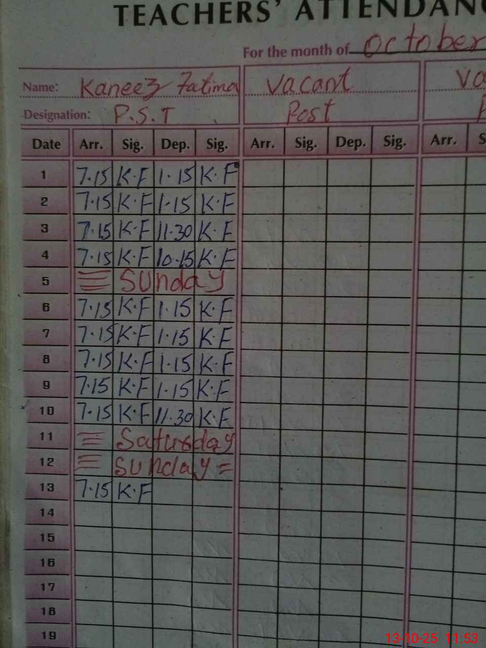 | CNIC | Full Name | Designation | R/C | Absence During Last Calender Month |