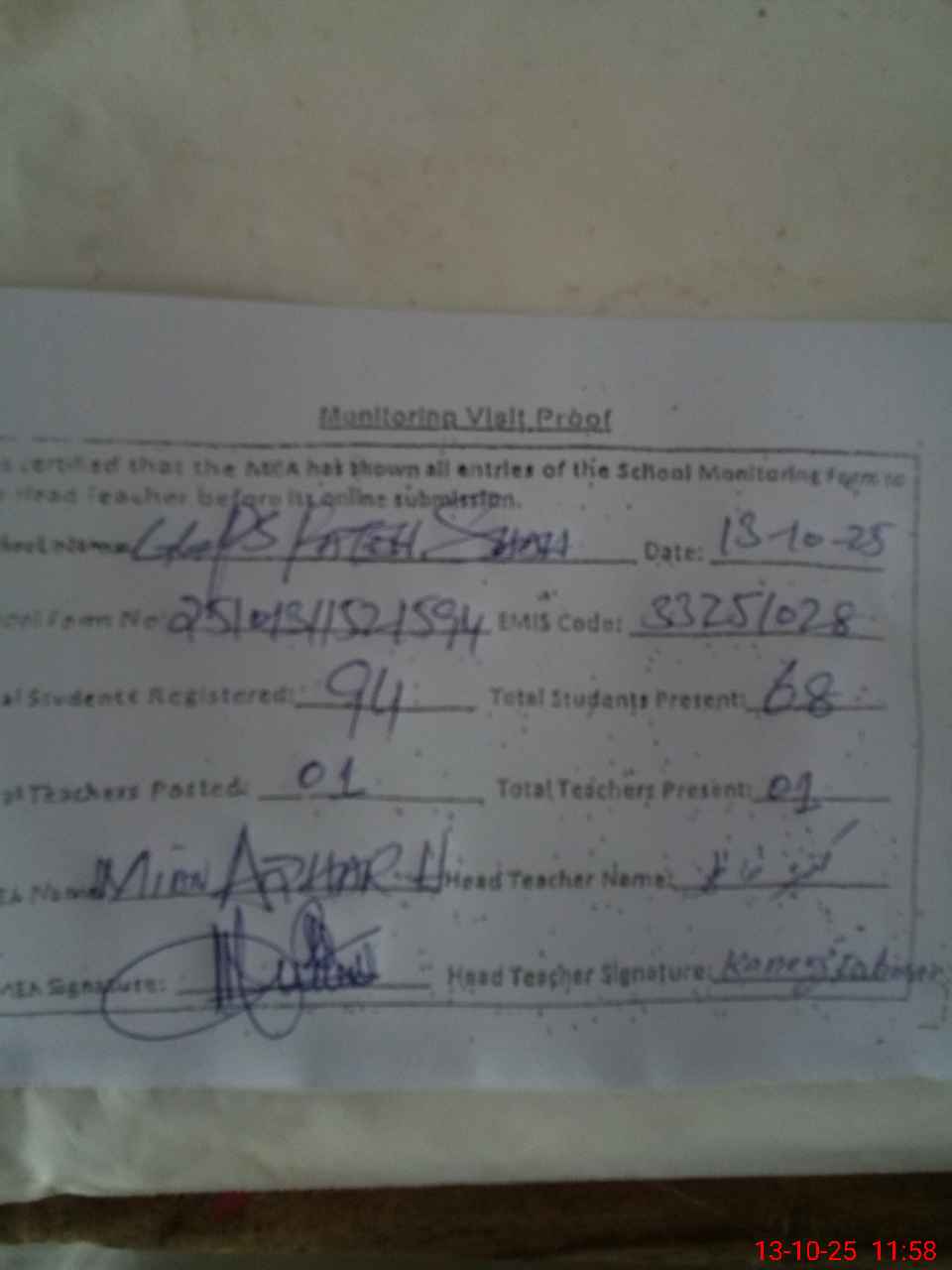 | Attendance Register | Head Teacher | MEA with School | Visit Proof |